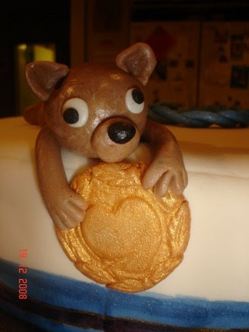 Isohko 8 munan kakku, täyttö kinuski-puolukka-kermalla ja pinnassa voi-sokerikreemin jälkeen kaulintamassaa... Nalle samaa tavaraa :)
